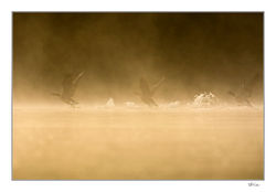 ![]() Buse variable | ![]() Des cris résonnent au loin dans la brume, j'espère que les Bernaches du Canada passeront devant mon affût... | ![]() Dans l'épais brouillard seul le fantôme d'un Grand cormoran et sa silhouette sont là. |